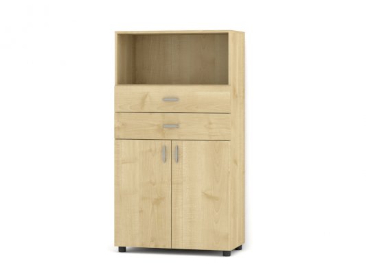 Корпус изготовлен из ЛДСП 16 мм с кромкой ПВХ 0,4 мм. Фасады изготовлены из ЛДСП 16 мм с кромкой ПВХ 2,0 мм. Задняя стенка изготовлена из ХДФ 4 мм. Опоры регулируемые - пластик чёрный. Петли - без доводчиков. Направляющие на ящиках - роликовые. Ручка 96 мм - хром. Данное изображение представлено в следующих цветах ЛДСП: корпус и фасады - Клён.
