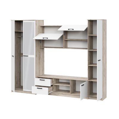 - Гостиная состоит из трёх модулей (шкаф платяной, шкаф бельевой, средняя секция), которые при желании можно устанавливать отдельно друг от друга, размещая в разных комнатах